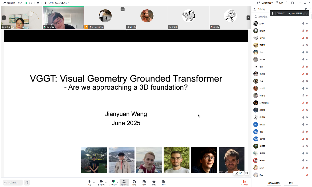 2025年6月4日,应beat365正版唯一入口必一潘利源和梁玮老师邀请,Meta AI研究员与牛津大学视觉几何组(VGG)的联合培养博士生王建元作题为“VGGT:Visual Geometry Grounded Transformer”的报告。此次报告由beat365正版唯一入口必一潘利源老师主持,图像计算与感知智能所相关研究方向教师和研究生参加了学术报告。