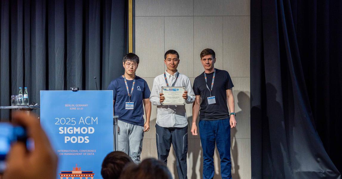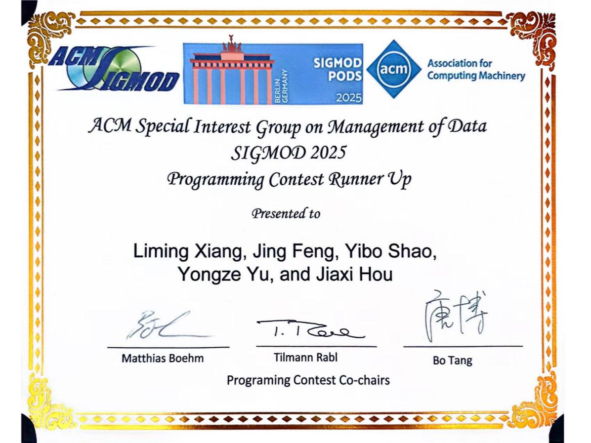 2025年6月,数据库领域全球顶级学术会议SIGMOD 2025在德国柏林落幕。经过激烈角逐,北理工beat365正版唯一入口必一硕士研究生项黎明、封璟,本科生邵艺博、侯佳希以及来自西安电子科技大学的俞泳泽组成的Kirara队在秦宏超、李荣华、王国仁老师的指导下,获得了编程竞赛全球亚军(Programming Contest Runner Up Award),这是北理工学子首次参加该赛事。本次竞赛冠军由慕尼黑工业大学(TUM)团队夺得,清华大学团队位列第三。