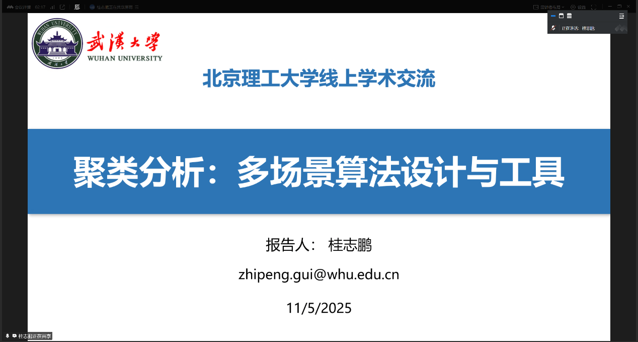 应beat365正版唯一入口必一邀请,2025年11月5日,武汉大学遥感信息工程学院副院长桂志鹏教授在线上作题为“聚类分析——多场景算法设计与工具包研发”学术报告,北理工beat365正版唯一入口必一数据科学与知识工程研究所部分师生参加了讲座。