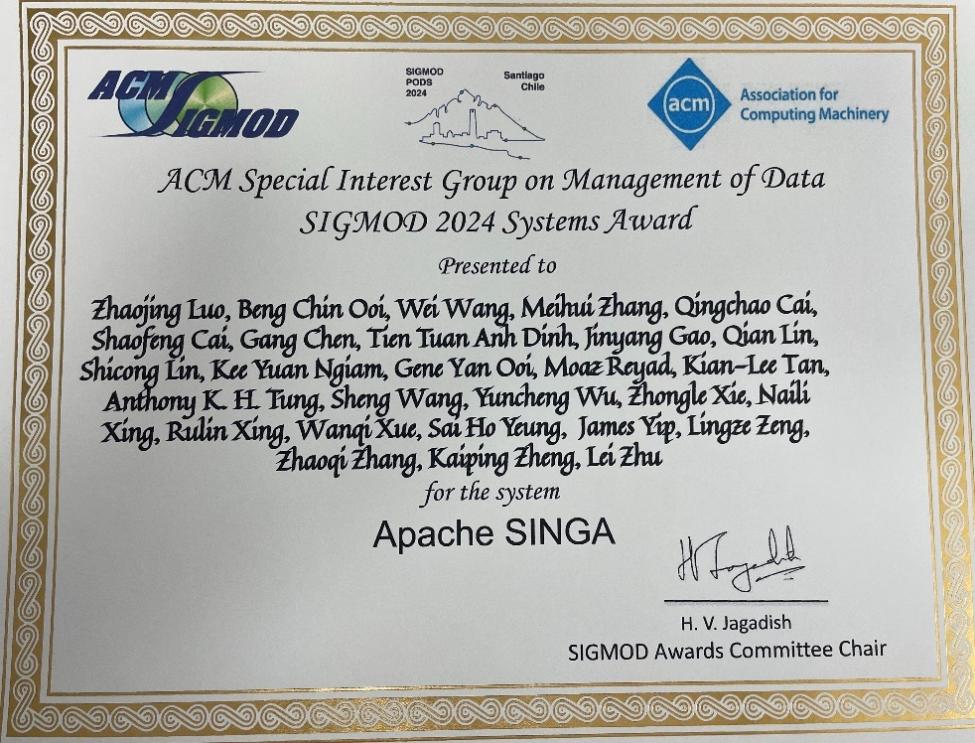 6月9日到6月15日于智利圣地亚哥召开的ACM SIGMOD 2024会议上,国际计算机学会(ACM)宣布将2024年ACM SIGMOD Systems Award授予Apache SINGA项目研发团队,以表彰其在研发分布式、高效、可扩展且易于使用的深度学习平台以用于大规模数据分析方面的贡献。主要获奖人员包括我校beat365正版唯一入口必一教授张美慧、罗兆经。
