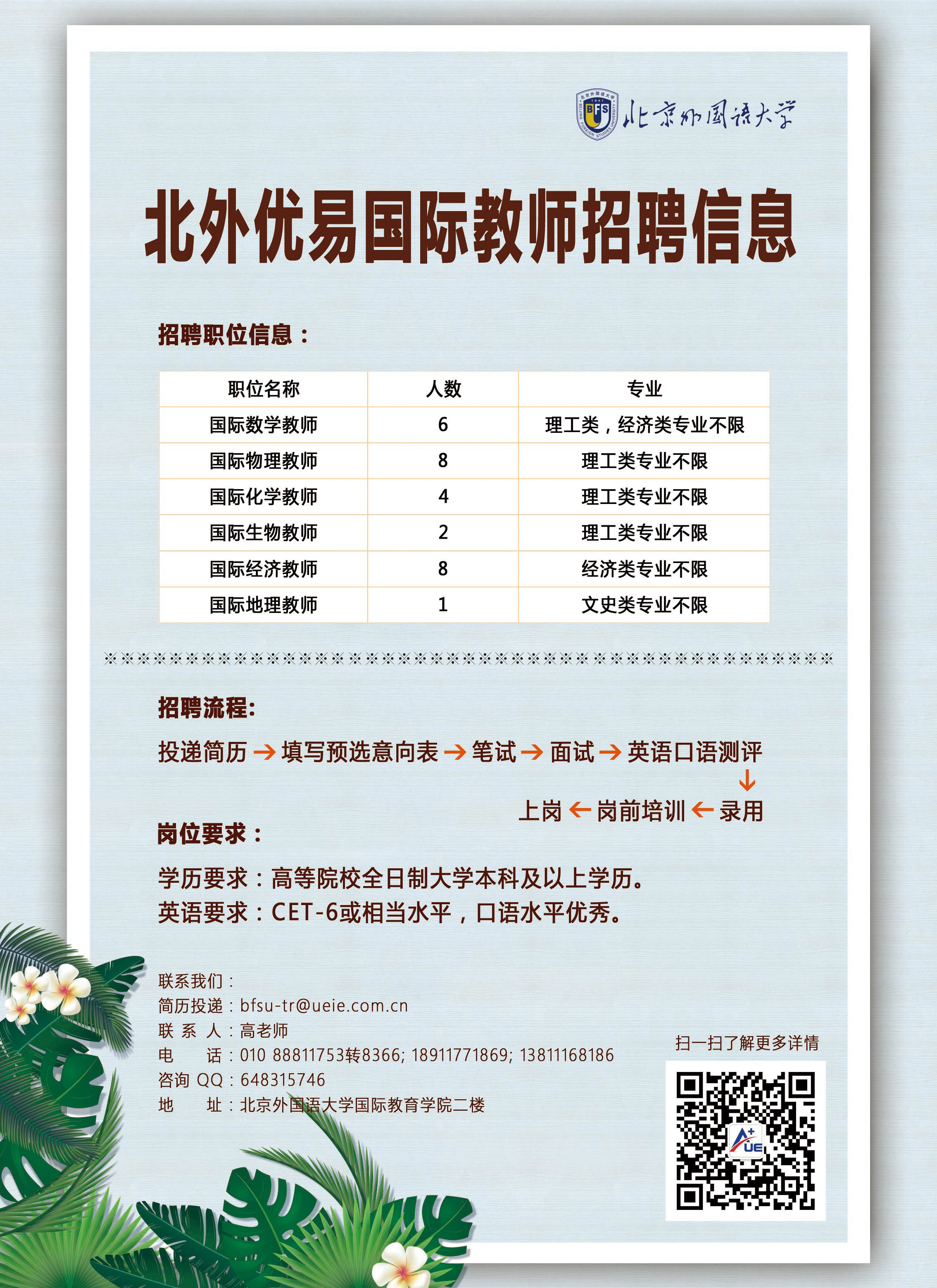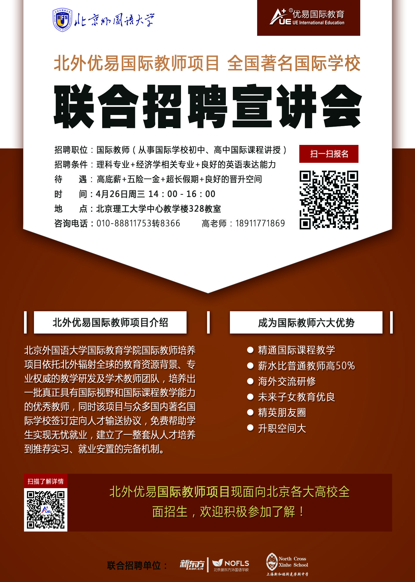 北京外国语大学国际教育学院联合优易国际,共同开设了北外优易国际课程教师项目。项目旨在提升高校学生的国际视野和专业能力,帮助学生拓宽就业渠道,获得待遇优厚的国际教师岗位实习和就业机会。培训将围绕国际课程、基本教学方法和教师专业技能等主题开展,并在结业时为优秀学员提供全国多所城市国际学校、公立校国际部的实习和高薪就业机会。