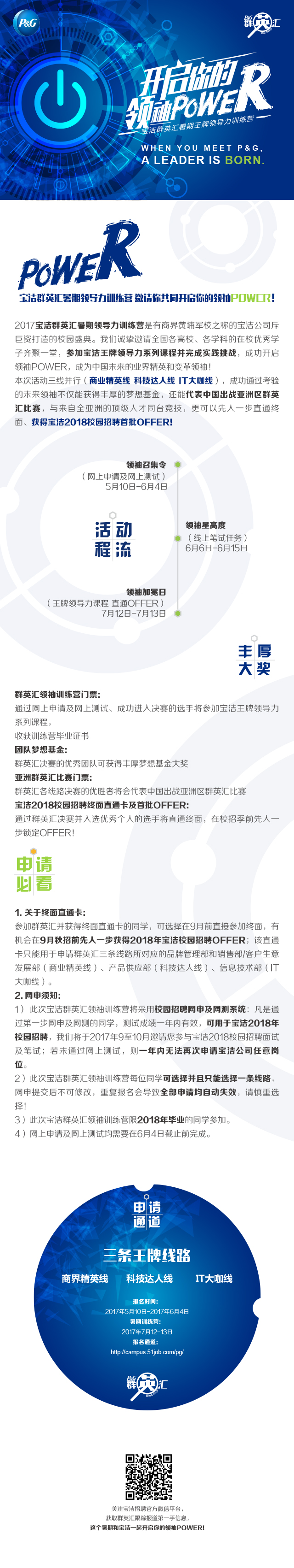 一年一度的“宝洁群英汇领袖训练营”即将开始,宝洁群英汇领袖训练营是宝洁和各大高校2018届毕业生之间一次盛大并深度互动的领袖训练营。