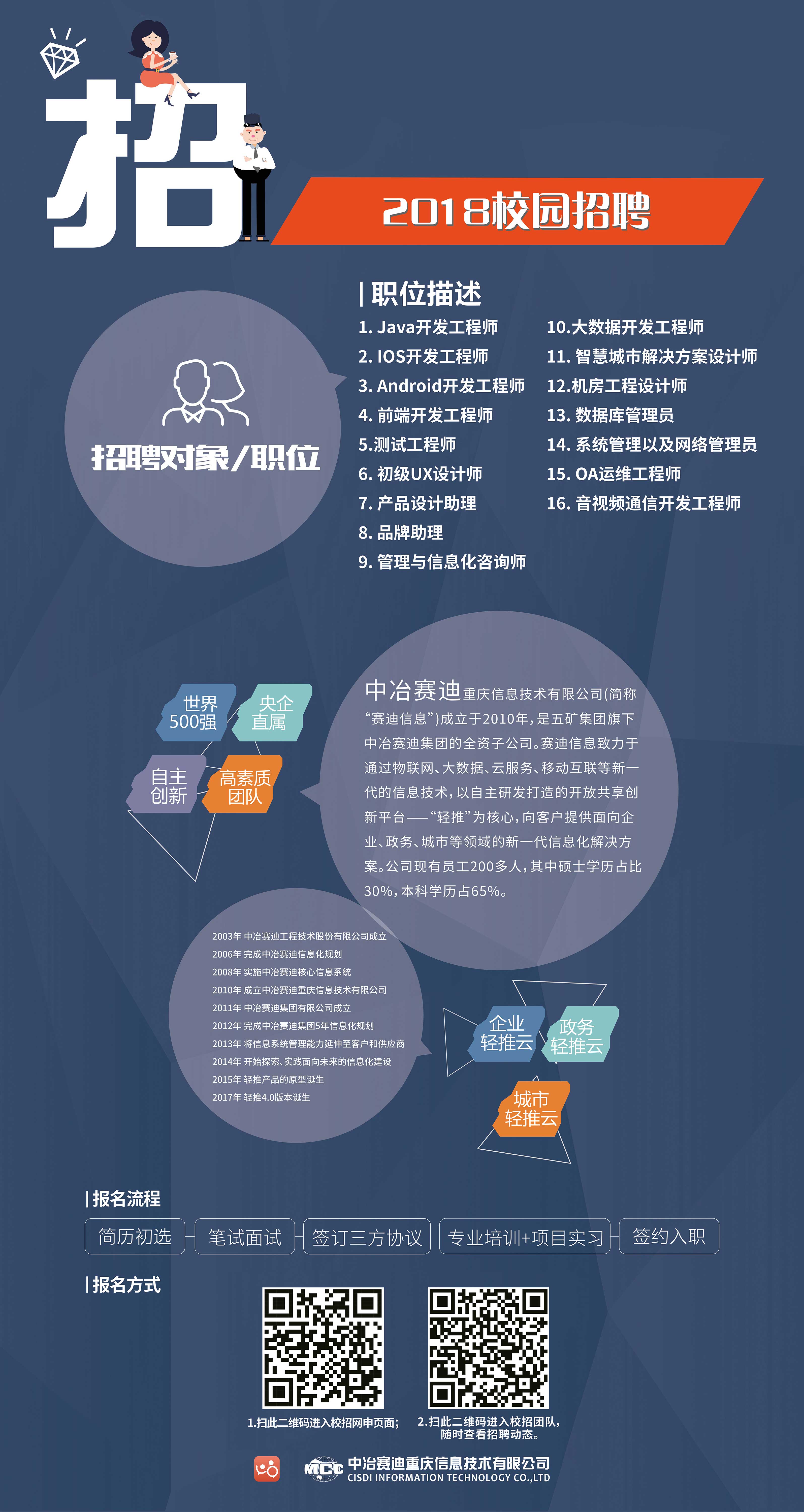 也可扫描图片二维码进入网申界面,完成简历投递流程。为更好地了解您的学习情况和相关经历,增加您成功应聘的几率,请详尽填写各项内容。为帮助您了解校招进程及相关问题,请下载轻推APP,扫描图片二维码申请加入“中冶赛迪信息公司2018届校园招聘”团队。